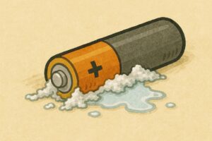 「スイッチ入れてないし、電池入れっぱなしでも問題ないでしょ?」と思っていませんか?でもそれは大きな誤解です。乾電池は使用していない状態でも、微弱な電流が流れる自然放電という現象が起こっています。この自然放電によって、電池は徐々に劣化し、最終的に液漏れや破損に至るのです。