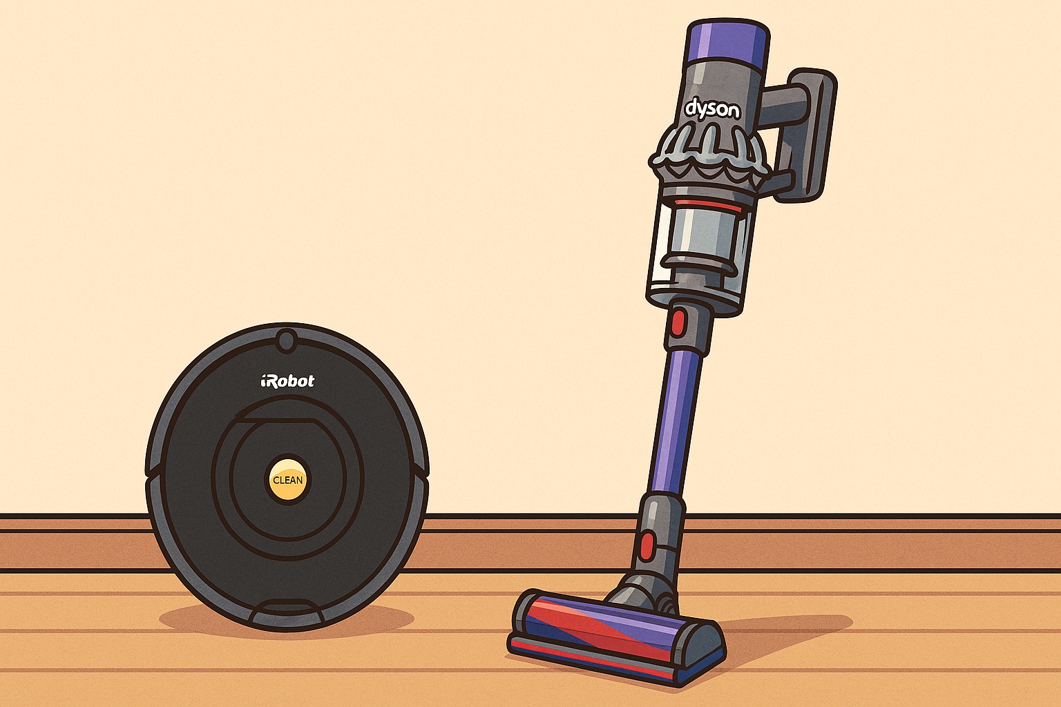ルンバは日常的な床掃除を自動でこなし、ダイソンは細かい部分や階段、