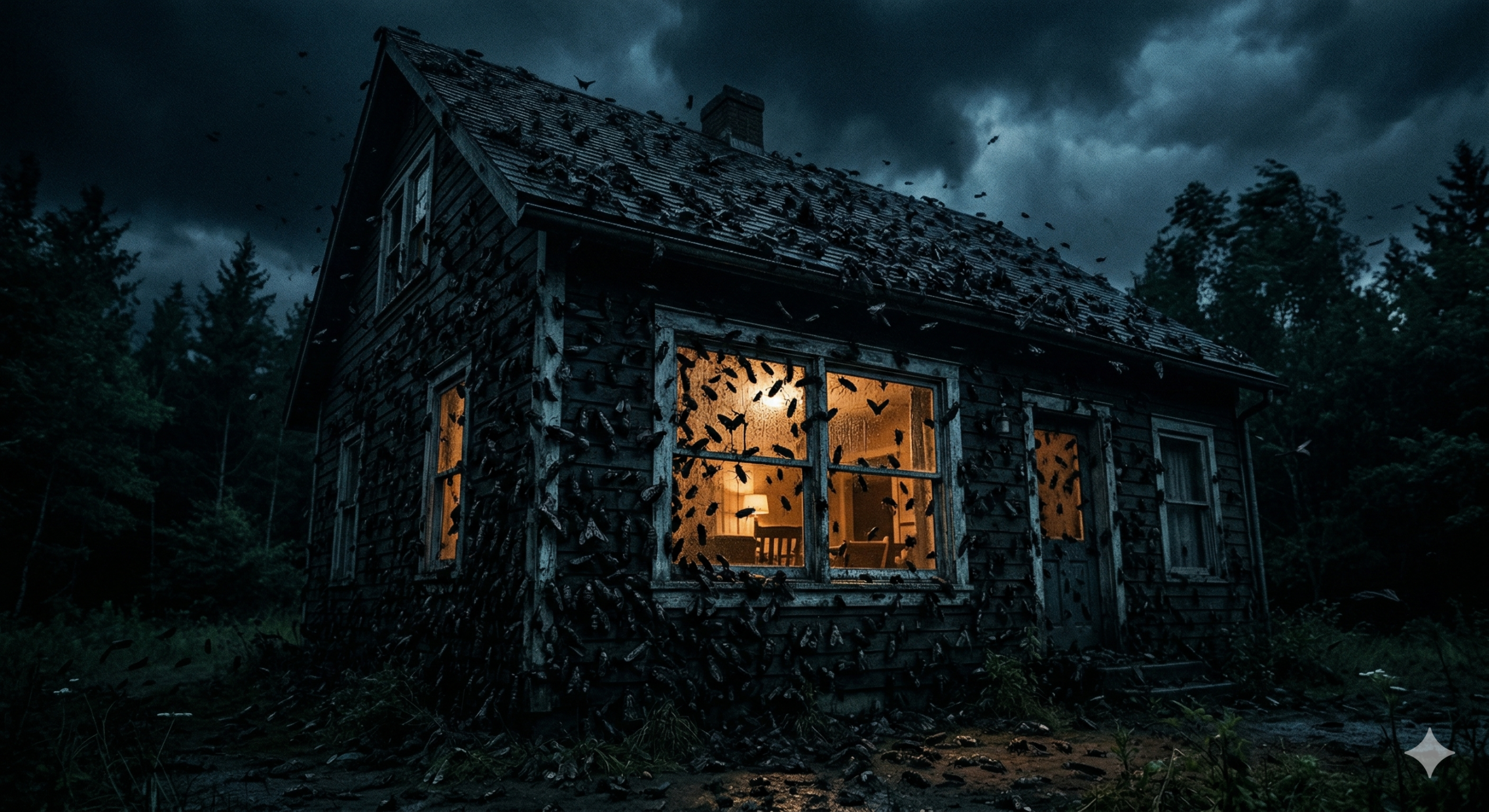 夜になると、蜂、クモ、ゴキブリといった無数の虫が家を覆い尽くし、内部へと侵入してくる。
